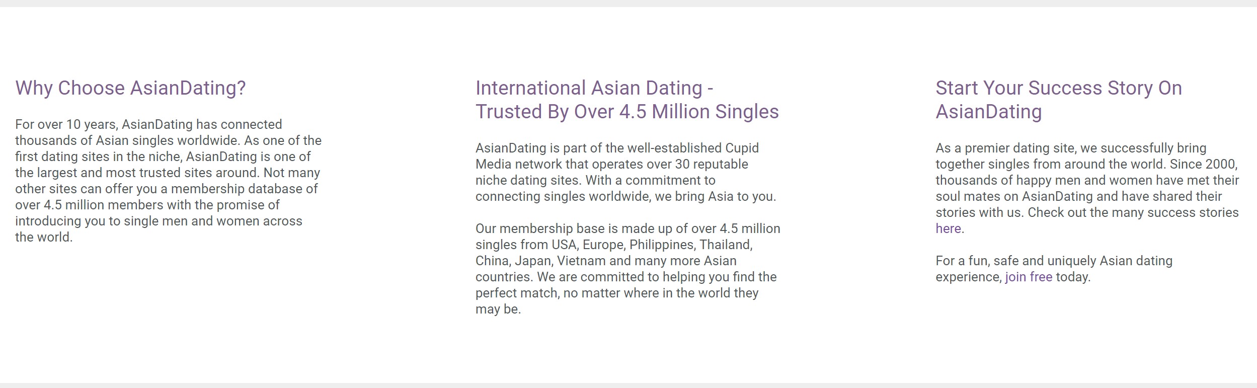 The site was created as a safe, friendly community for Asian singles to connect beyond borders. AsianDating understands the unique dating preferences and expectations of its members and provides tailored matching tools to help them find their ideal partner. The site promises to introduce you to single men and women across the globe, helping you find your perfect match. In this AsianDating.com review, you’ll see the ins and outs of the site, the features offered, pricing, how the sign-up process works, and anything else pertinent that you might need to know to make a decision on whether or not this site is for you.