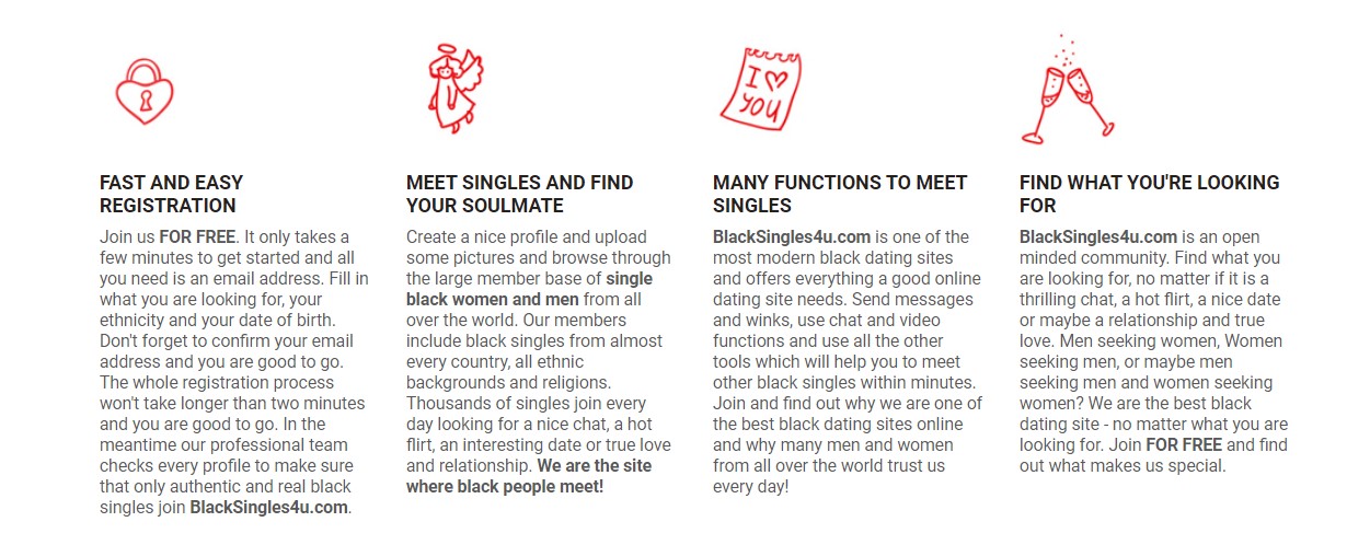 BlackSingles4u.com boasts an impressive range of features designed to connect black singles seeking meaningful relationships online. For black singles seeking a tailored dating platform to find love, Black Singles 4u checks all the boxes. Their niche focus on the black community provides a safe space to connect with culturally-aligned individuals. Combined with their nuanced search filters and communication features, the site fosters deep, authentic connections.